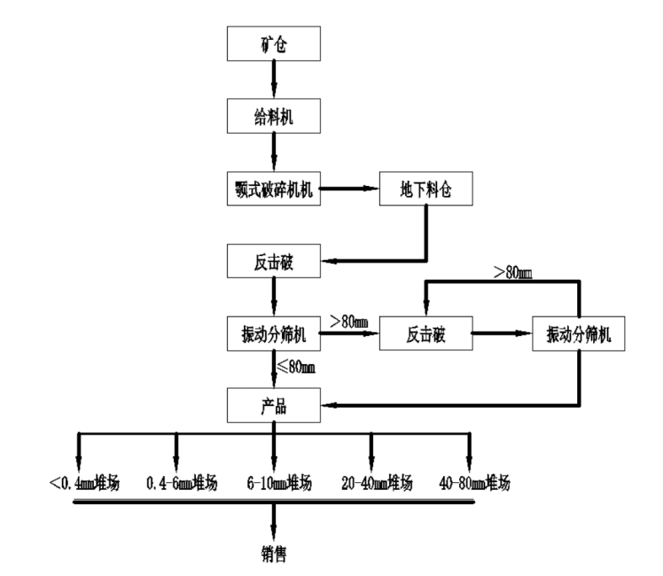 礦山現(xiàn)有破碎站采用兩級(jí)破碎、兩級(jí)篩分的閉路返回流程,機(jī)械化程度較高,可將礦石加工成不同需求的五級(jí)原料。破碎后的礦石原料對(duì)外進(jìn)行銷售,礦石加工工藝系統(tǒng)流程圖如下: