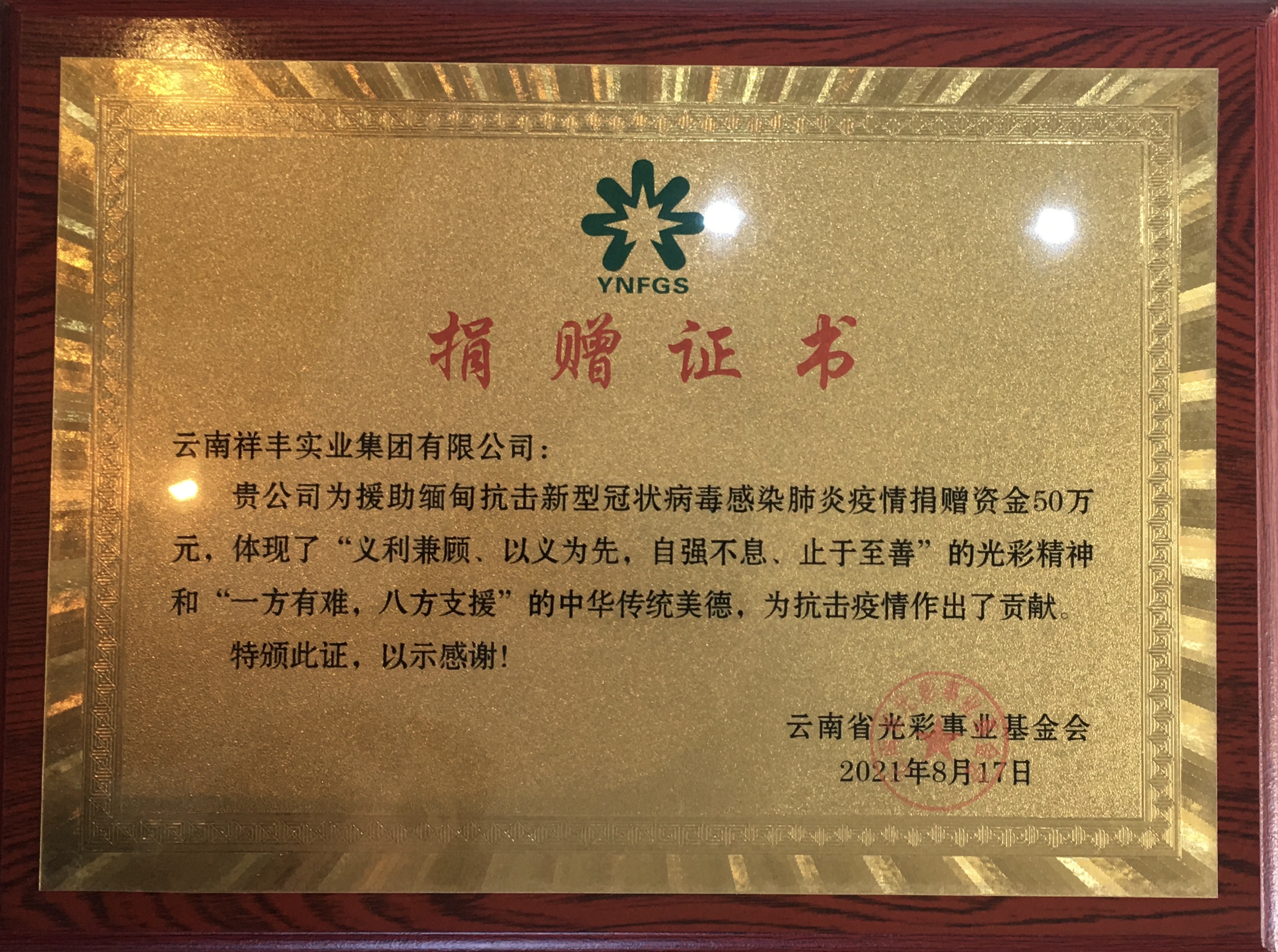 2021援緬抗疫捐贈50萬證書