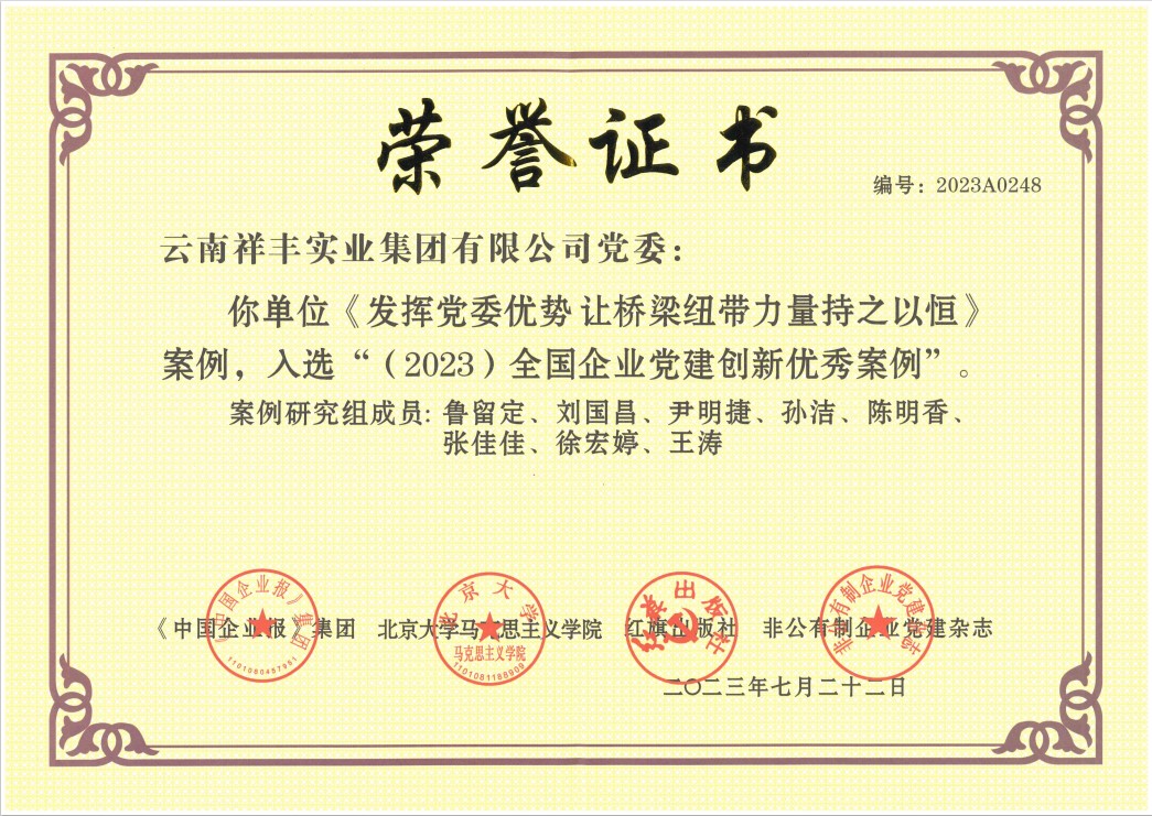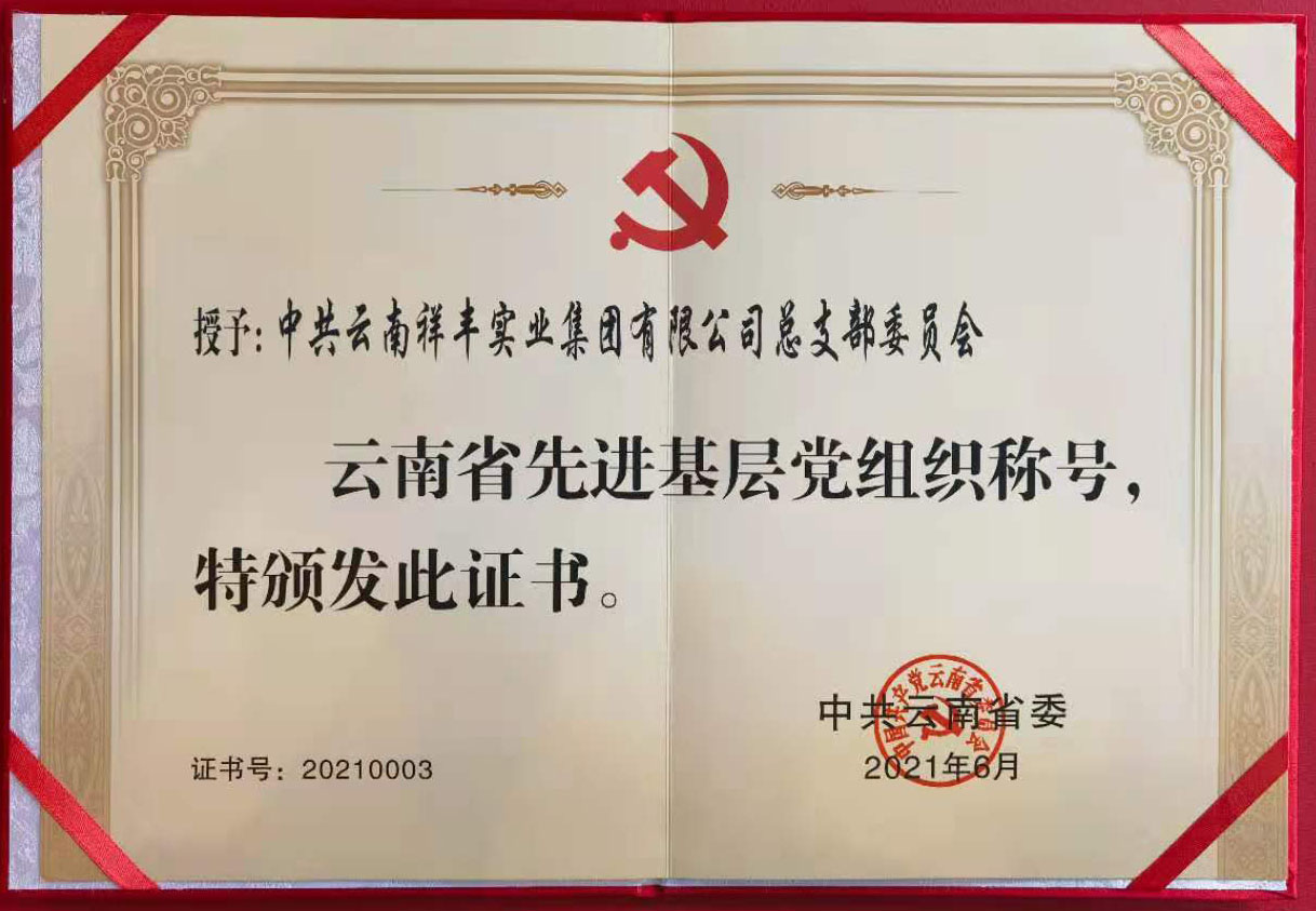 2013年7月,祥豐黨支部2011—2012年度"云嶺先鋒"工程被中共連然街道工作委員會評為"先進(jìn)基層黨組織";2013年7月,祥豐黨支部被中共安寧市委評為"基層黨建示范點(diǎn)";2013年7月,公司團(tuán)工會楊洪銘被推薦為"安寧市青年聯(lián)合會第二屆委員會委員";2013年7月,公司團(tuán)工委組織公司全體職工團(tuán)員青年開展"愛心水窖"捐款活動(dòng),祥豐集團(tuán)