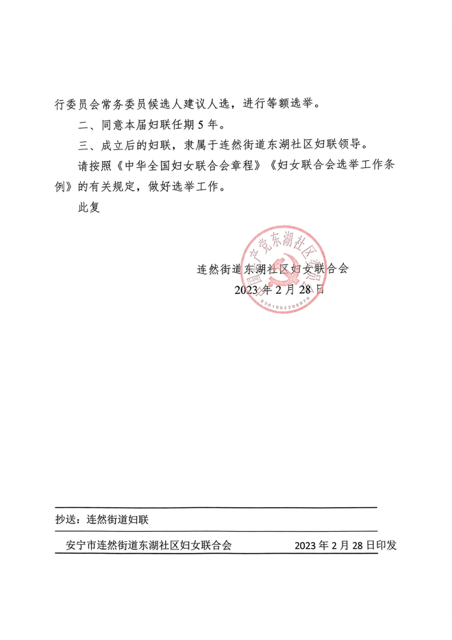 經(jīng)安寧市連然街道東湖社區(qū)婦女聯(lián)合會“聯(lián)東婦發(fā)[2023]1號”、“聯(lián)東婦發(fā)[2023]2號”文件批復(fù),云南祥豐集團(tuán)于2023年3月2日召開婦女代表大會,正式組建云南祥豐實業(yè)集團(tuán)有限公司婦女聯(lián)合會。